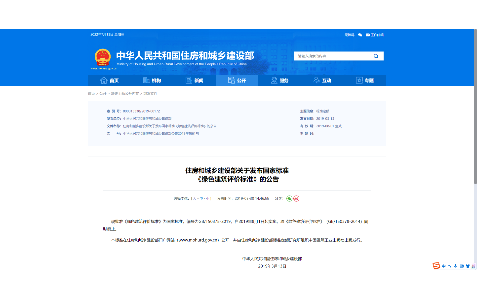 住房和城乡建设部关于发布国家标准 《绿色建筑评价标准》的公告